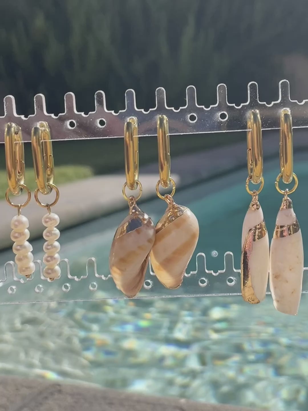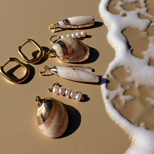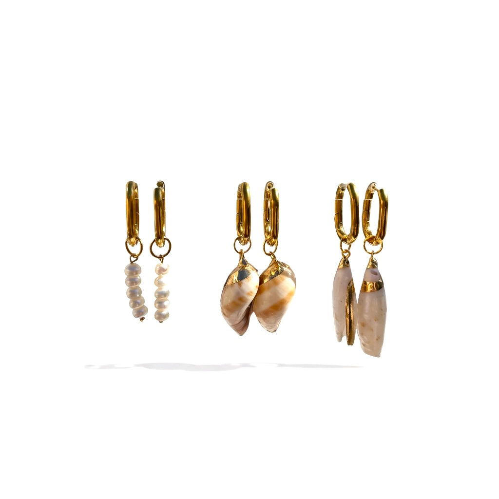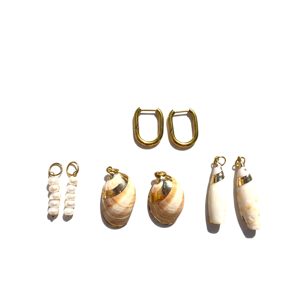 Featuring our large Huggies, paired with a Tiny Pearl Stack, a natural Cowrie Shell, and a delicate Auger Shell, this set captures the magic of the ocean and the freedom to style it your way.