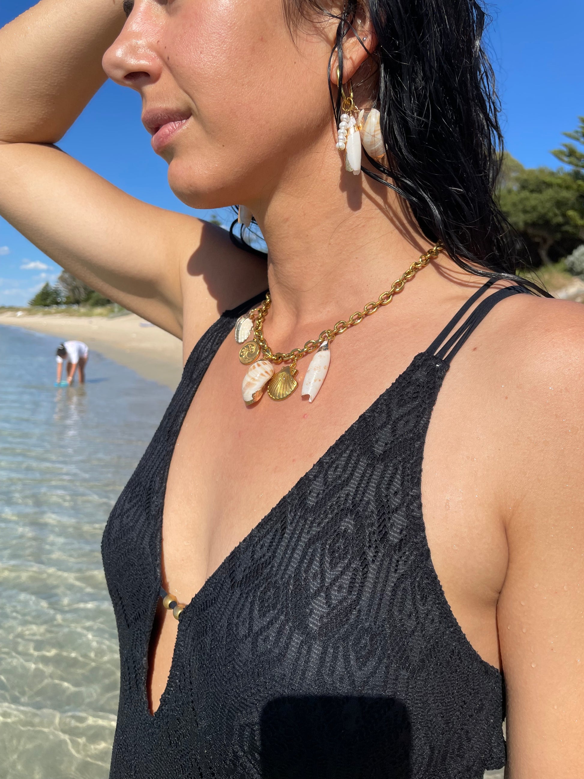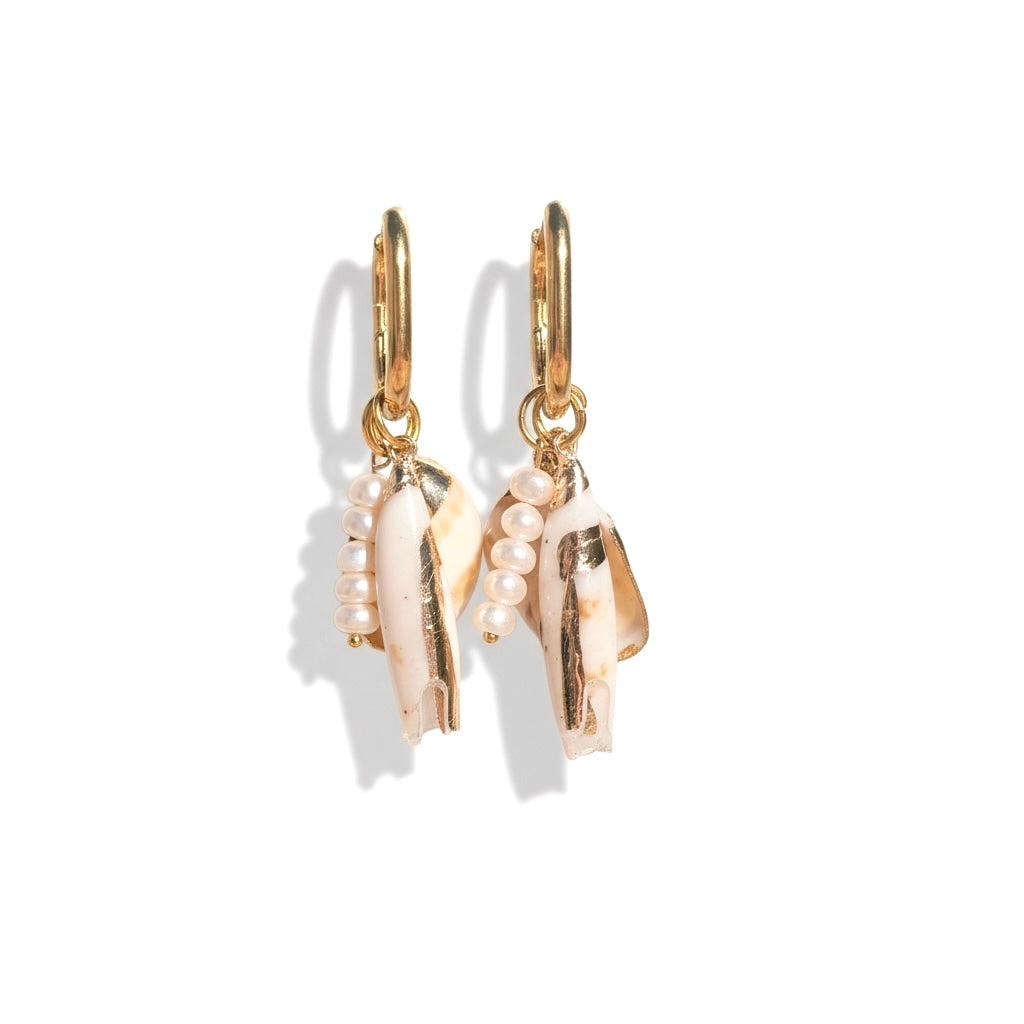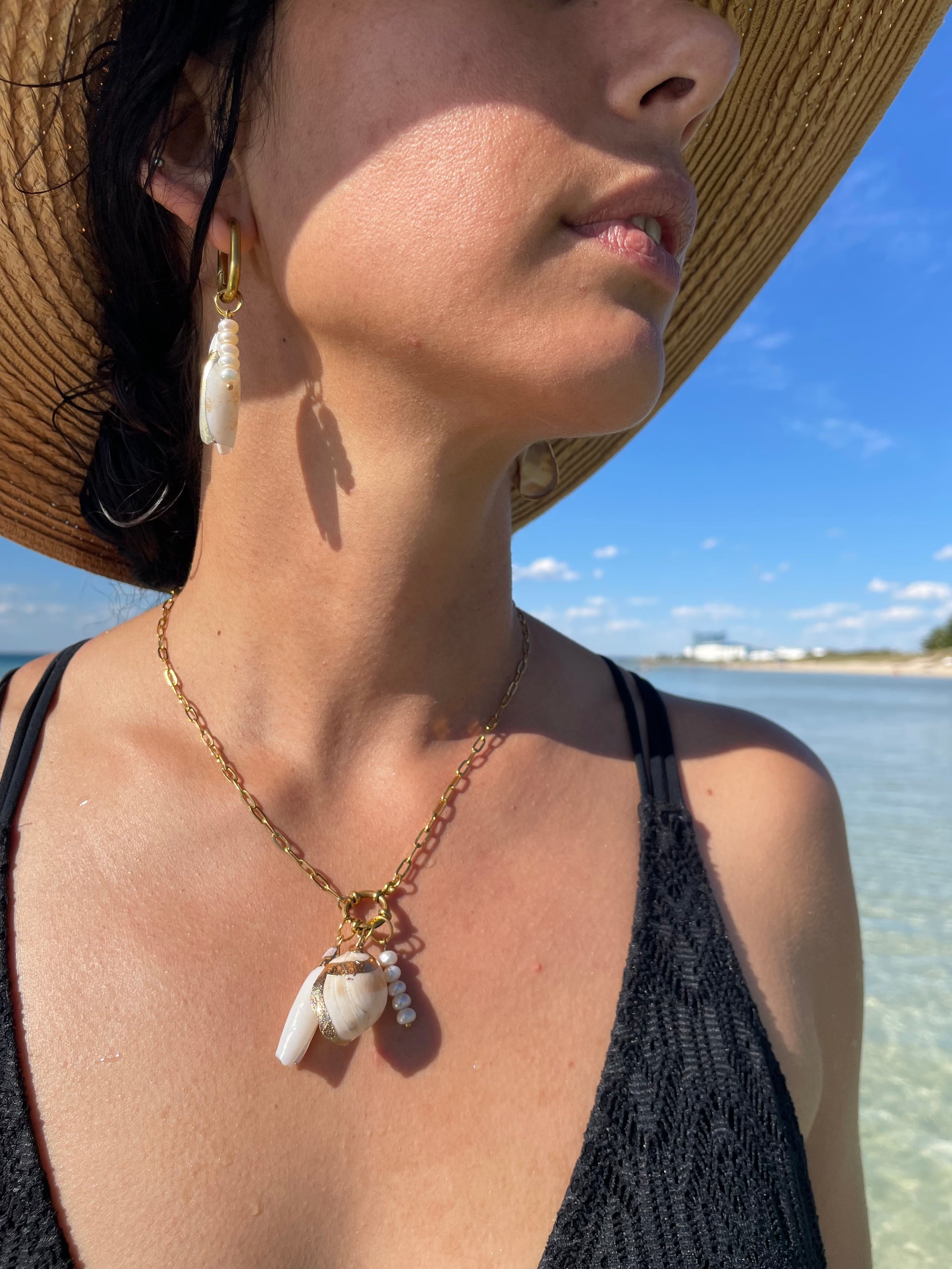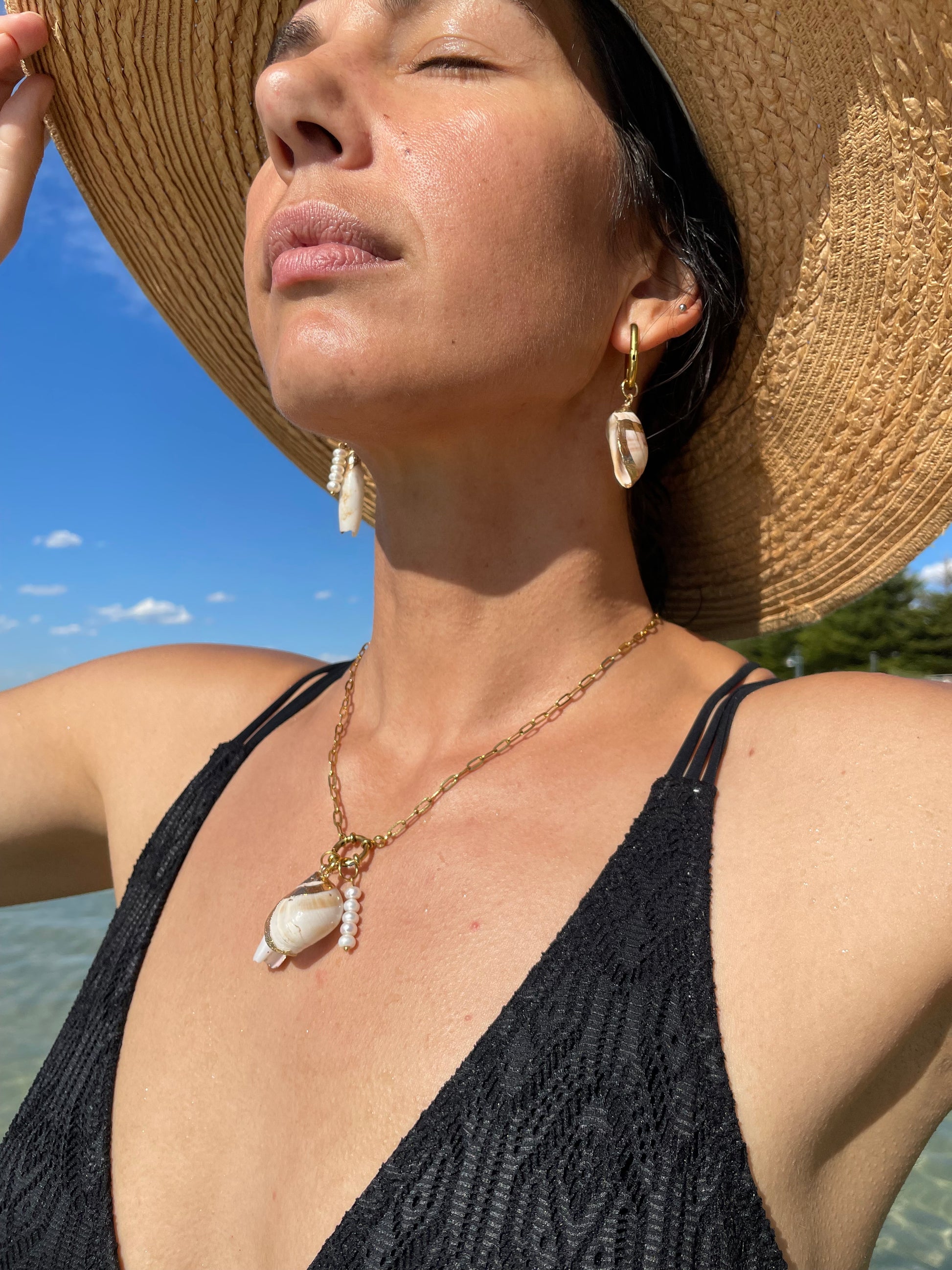 Featuring our large Huggies, paired with a Tiny Pearl Stack, a natural Cowrie Shell, and a delicate Auger Shell, this set captures the magic of the ocean and the freedom to style it your way.